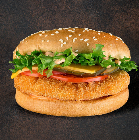 куриное филе в панировке, сыр Чеддер, помидор, салат Айсберг, маринованный огурчик, сырный соус и кетчуп