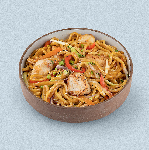 пшеничная лапша с курицей и овощами в соусе имбирный Терияки