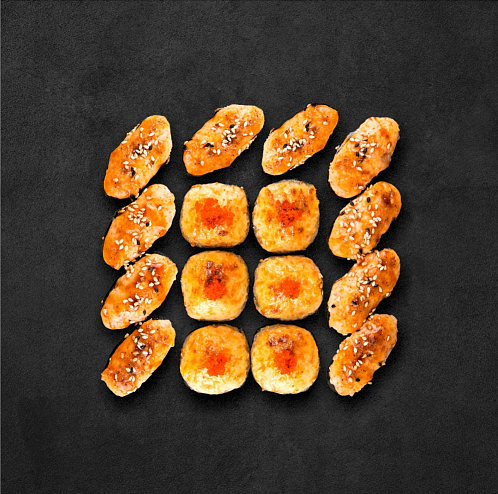 1 ролл + 10 суши: ролл Яки тай маки (окунь, снежный краб, японский омлет, масаго, сырный соус с чесноком, Спайси соус); 5 запеченных суши с лососем. 5 запеченных суши с мидиями
