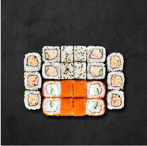 3 ролла: Филадельфия кани тобико (сливочный сыр, снежный краб, огурец, японский омлет, масаго); ролл Калифорния (снежный краб в Яки соусе, огурец, кунжут); острый ролл с крабом (снежный краб в Спайси соусе, кунжут)