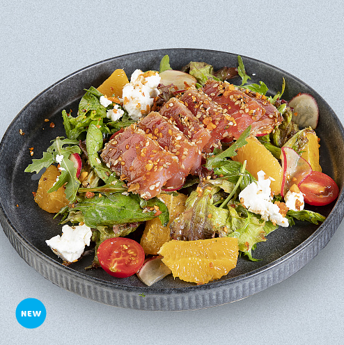 Нежное филе тунца в кунжутной панировке с миксом салатов, помидорами черри в ореховом и цитрусовом соусах, с кунжутом Кимчи и перченым арахисом