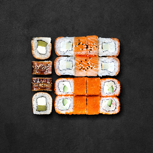 2 ролла + 1/2 ролла: Филадельфия кани тобико (сливочный сыр, снежный краб, огурец, японский омлет, масаго); Филадельфия лайт (лосось, сливочный сыр, японский омлет, кунжут); 1/2 ролла Унаги тизу маки (угорь, сливочный сыр, маринованный дайкон, Унаги соус, кунжут)